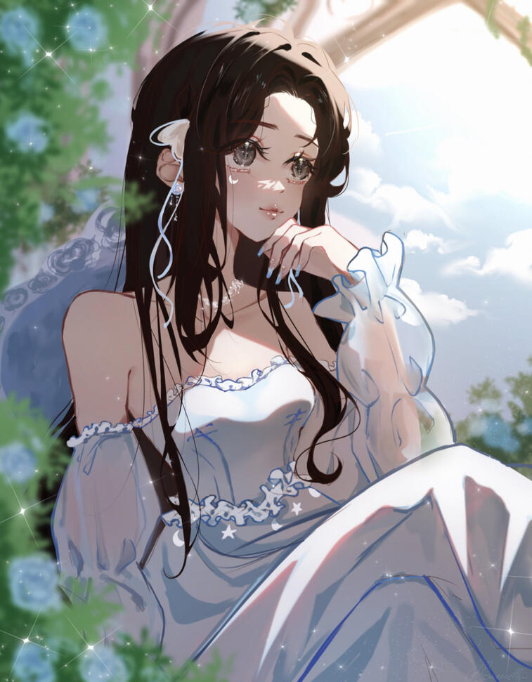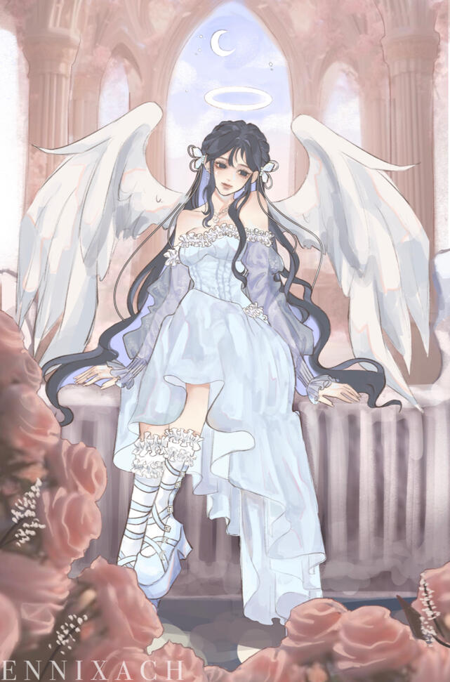 Born of the celestial heavens, her existence was a testament to the complexities of angelic beings. Once revered among the celestial beings as a paragon of purity and light, she now traversed the realms as a figure untethered by the constraints of celestial hierarchy.Behind her angelic facade lay a soul scarred by betrayal, a heart that bore witness to the injustices perpetrated by the very authority she once served. By defying authority, she was cast out from the heavens. Her descent into the mortal realm marked the beginning of a new chapter in her journey.And how could they possibly take away her powers when the angels loved her? She retained her angelic form, with wings of celestial beauty and a halo that radiated purity. As a fallen angel, she now also possessed a demonic form, rarely ever seen by mortal eyes. However, she predominantly assumed her natural "human-like" appearance, concealing her celestial and infernal nature from those she encountered.With a mere thought, she wielded control over the elements, bending the very fabric of reality to suit her desires. She could shape clouds and manipulate them to her will, molding them into various forms and even riding atop them as if they were steeds of the heavens, allowing her to traverse the skies with grace and agility. She summoned storms with a gentle but commanding presence, coaxing the clouds to gather and release a symphony of rain. Her bolts of lightning lit up the sky with brilliant flashes, illuminating the world below and sending tremors through the ground with their electrifying power. She could create intricate patterns of frost that adorned the landscape, or summon blizzards that engulfed the land in a blanket of snow and ice. The precipitation she conjured was as elegant as it was formidable, capable of both nourishing the earth and weathering it, its effects dependent on her intent. She could bring life and growth or herald destruction and chaos, a reflection of her dual nature as a being of light and darkness.Amidst her mastery over the elements, she wielded another power, one that spoke of her descent into darkness. From the depths of her soul, she summoned spectral apparitions, manifestations of her newfound malevolence. Among them, a spectral wolf prowled at her side, its ethereal form shrouded in mystery and aloofness.In her hands, she wielded chains of darkness, intangible yet unyielding, capable of ensnaring her foes and binding them in spectral shackles. Like wisps of shadow woven into the fabric of reality, these chains defied the laws of physics, passing through solid matter with ease.Yet, she had a soul steeped in indifference; a being consumed by a sense of detachment from the world around her. An eternal wanderer through the boundaries of every realm, her presence serves as a guide for the indomitable spirit of the fallen.